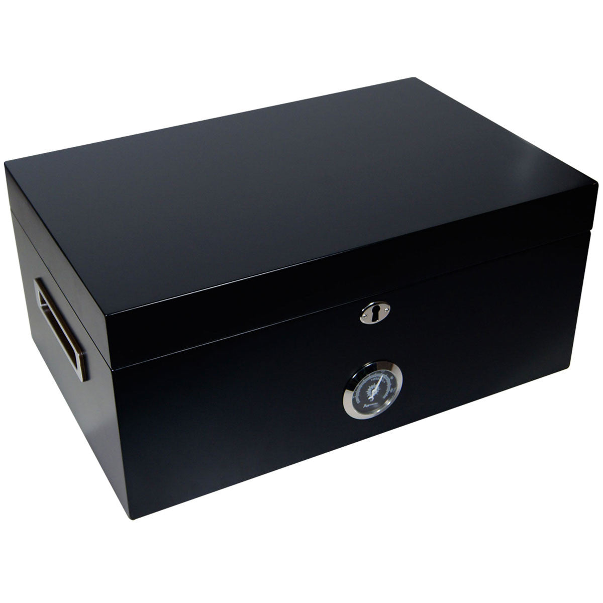 CCH-MURCIELAGOThis heavy weight brings a Spanish cedar aerator tray and tray divider, bottom divider and easy to carry handles. Its solid chrome hardware includes hidden quadrant piano hinges, lock and keys, hygrometer and chrome front-panel humidifier. They all match the beautiful black cigar humidor's exterior and rich Spanish cedar interior. This Ebony humidor also has a removable wood cover in the lid's interior for the humidifier, and the hygrometer is in the front so you can keep track of the humidity without having to open the humidor. Dimensions are 15 wide X 10 depth X 6 1/2 height, and it has a capacity of 150 cigars.