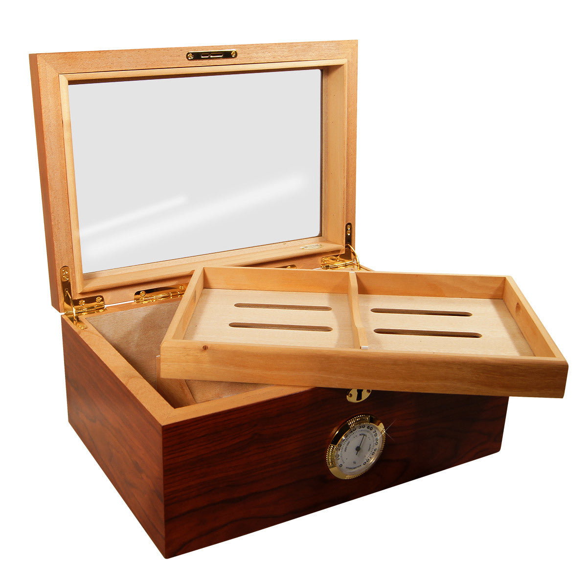 DISPLAY HUMIDORS - Glass Top Humidor Bubinga is a rich and elegant display humidor with a Gloss Rose Wood exterior and a Tempered Glass top. Features of the humidors include a Spanish Cedar Interior, a large outside Hygrometer, a Humidification System, a removable tray, removable divider, and a gold plated lock and key. This elegant display unit also has Hidden gold plated Quadrant Hinges, a scratch resistant felt lined bottom, full instructions and the best guarantee in the industry.